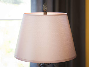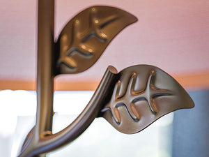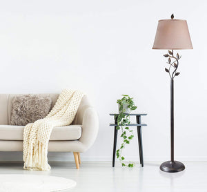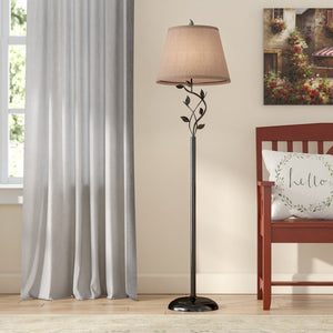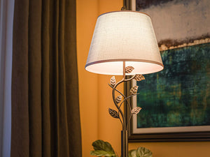 The simple finish lets this lovely luminary blend in with any ensemble, while the scrolling top design with leaf accents imbues it with artful appeal. This lamp is also topped with a classic bell shade with neutral-toned fabric for a touch of traditional appeal.